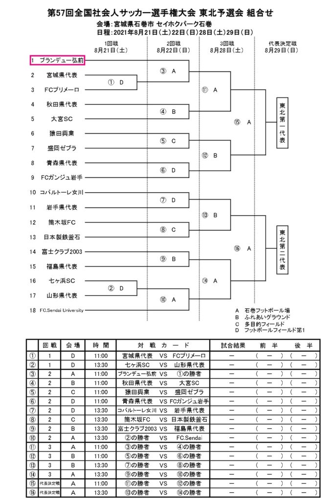 「第57回全国社会人サッカー選手権大会 東北予選会」の試合日程が決定しましたのでお知らせいたします。ブランデュー弘前FCは2回戦からの出場となります。代表決定戦に勝利すると、栃木県で10月9日(土)から開催される「第57回全国社会人サッカー選手権大会」へ出場することができます。